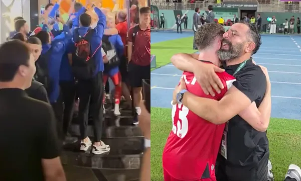 Các cầu thủ lẫn Ban huấn luyện đại diện Tây Á vừa hát vang reo hò, vừa tay bắt mặt mừng, gửi lời cảm ơn đến toàn thể thành viên "Những chiến binh sao vàng".