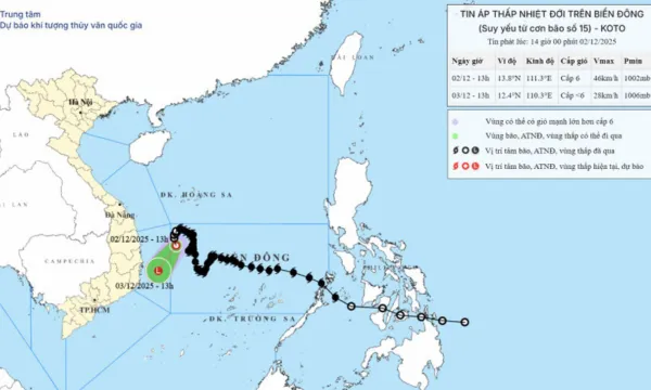 Theo Trung tâm Dự báo Khí tượng Thủy văn Quốc gia, áp thấp nhiệt đới vẫn giữ nguyên cường độ, hướng di chuyển, dự báo ngày 3/12, áp thấp nhiệt đới suy yếu thành vùng áp thấp.