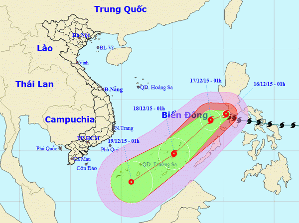 Đến 01 giờ ngày 17/12, vị trí tâm bão ở vào khoảng 13,0 độ Vĩ Bắc; 118,8 độ Kinh Đông, cách đảo Song Tử Tây (thuộc quần đảo Trường Sa) khoảng 530km về phía Đông Đông Bắc. Sức gió mạnh nhất ở vùng gần tâm bão mạnh cấp 10, cấp 11 (tức là từ 90 đến 120km một giờ), giật cấp 12-13. Do ảnh hưởng của hoàn lưu bão kết hợp với gió đông bắc mạnh nên vùng biển phía Đông khu vực giữa Biển Đông có gió mạnh cấp 7-9, vùng gần tâm bão đi qua cấp 10-11, giật cấp 12-13. Sóng biển cao 3-5m. Biển động dữ dội. Cấp độ rủi ro thiên tai: cấp 3.