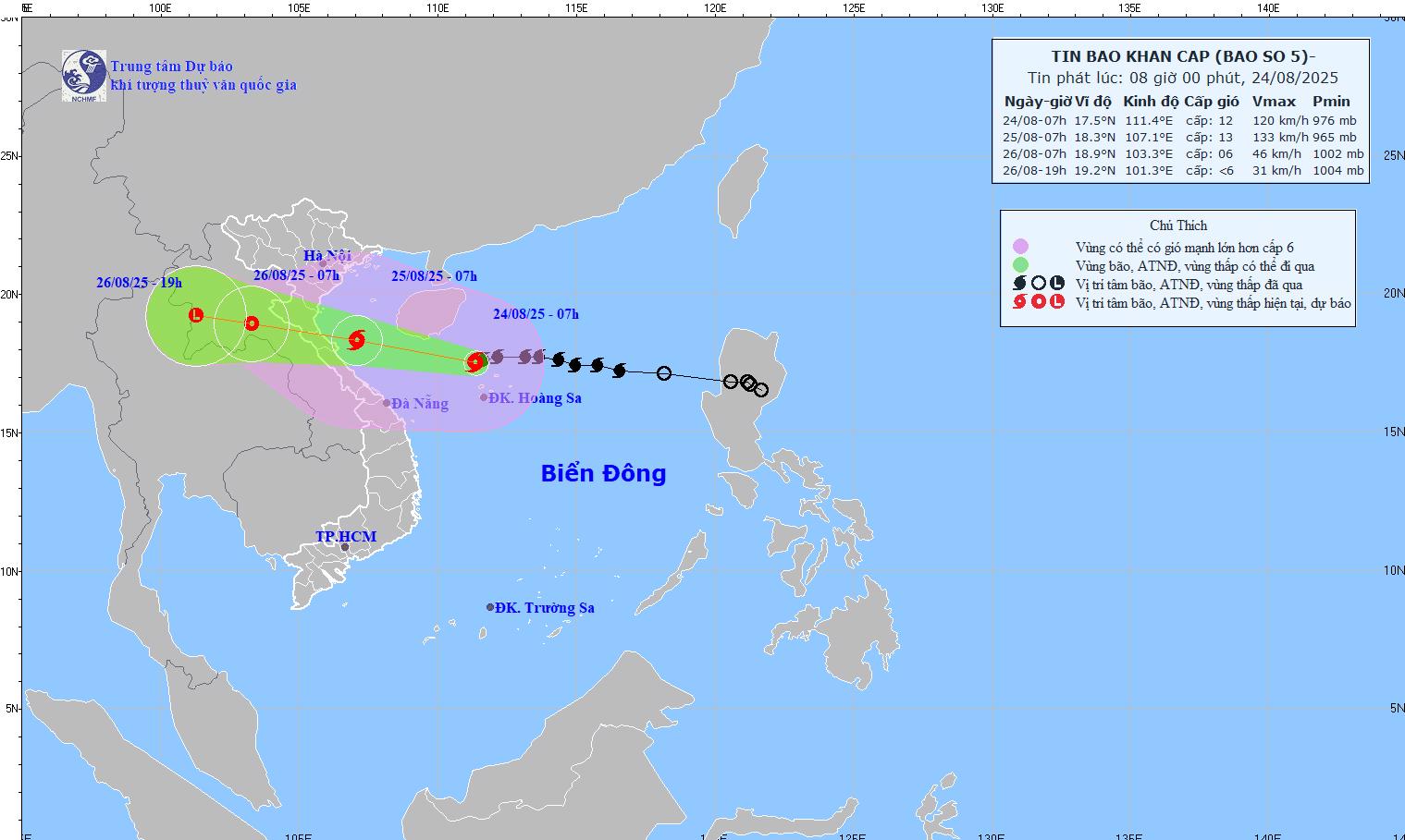 Dự báo, đến 7h ngày 25/8, bão sẽ ở tọa độ 18,3°N – 107,1°E, trên khu vực Nam vịnh Bắc Bộ, cách Nghệ An khoảng 160 km, Hà Tĩnh 140 km. Cường độ được dự báo duy trì cấp 12–13, giật cấp 15, thậm chí có khả năng mạnh thêm.