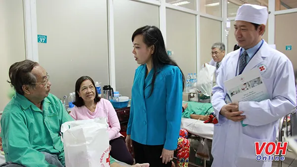 Bộ Trưởng Nguyễn Thị Kim Tiến và bác sĩ Phan Văn Báu - Giám đốc Bệnh viện Nhân dân 115 đến thăm tặng quà cho bệnh nhân