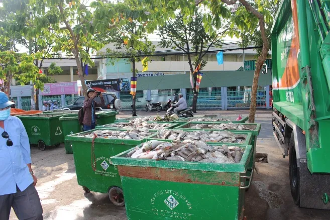Công ty Môi trường Đô thị thành phố đã tiến hành thu gom xác cá để tránh gây ô nhiễm nguồn nước dòng kênh.
