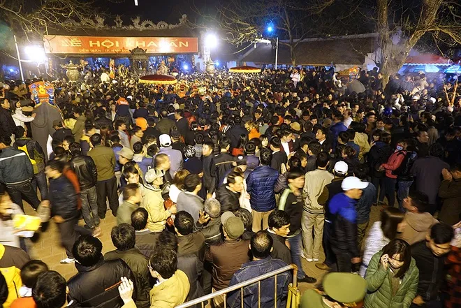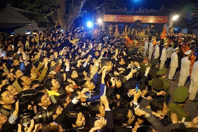 Phía dưới sân đền, giữa dòng người chen nhau, bất chấp sự hiện diện của lực lượng chức năng, nhiều người cố gắng cướp, giật lộc từ các kiệu ấn, bàn thờ. Ảnh: VNE