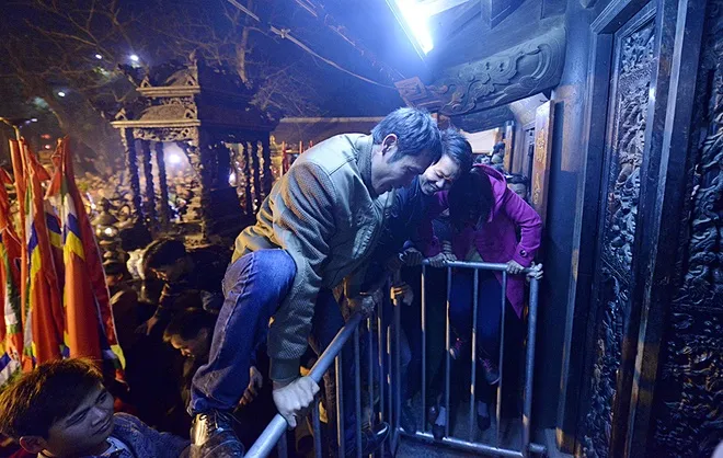 Nhiều thanh niên đã bất chấp sự tôn nghiêm và sự an toàn của người xung quanh vượt rào vào điện để mong nhận được lộc ấn sớm nhất. Ảnh: VNE
