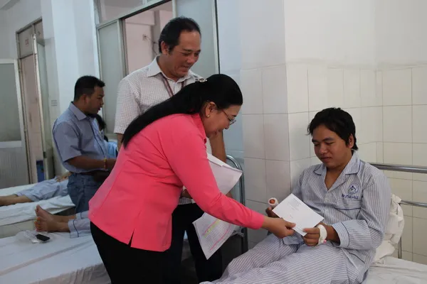 Đại diện LĐLĐTP và Công đoàn công ty Pou Yuen thăm công nhân bị tai nạn giao thông tại các bệnh viện.
