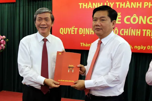 Ông Đinh Thế Huynh (trái) trao quyết định của Bộ Chính trị phân công ông Đinh La Thăng, Ủy viên Bộ Chính trị làm Bí thư Thành ủy TPHCM. Ảnh: TNO