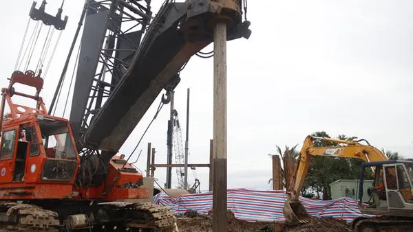 Lực lượng đang tiếp tục đào đất bằng gầu cạp kết hợp gầu ngoạm đối với vị trí không bị vướng 3 đầu cọc bê tông bên ngoài ống vách, sử dụng 2 vòi xói cắt phá đất tại các khu vực chật hẹp mà gầu cạp, gầu ngoạm không thao tác được.