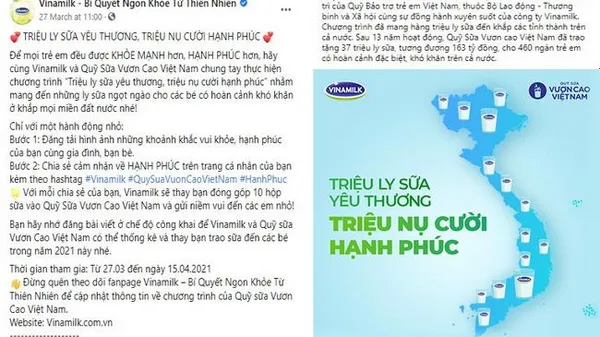 Và để khởi động hành trình năm 2021, với mục đích kêu gọi sự chung tay để mang sữa đến với trẻ em khó khăn, kém may mắn, Vinamilk đã tổ chức chiến dịch online mang tên “Triệu ly sữa yêu thương, triệu nụ cười hạnh phúc”.