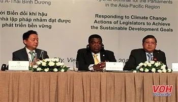 Phiên họp báo ngay sau khi hội nghị chuyên đề Liên minh nghị viện thế giới (IPU) khu vực về ứng phó với biến đổi khí hậu hành động của các nhà lập pháp vừa kết thúc (từ trái qua: Bộ trưởng Bộ Tài Nguyên và Môi trường Trần Hồng Hà; Tổng thư ký nghị viện thế giới Marti Chungong, ông Nguyễn Văn Giàu – Ủy viên Trung ương Đảng – Chủ nhiệm Ủy ban Đối ngoại Quốc hội)