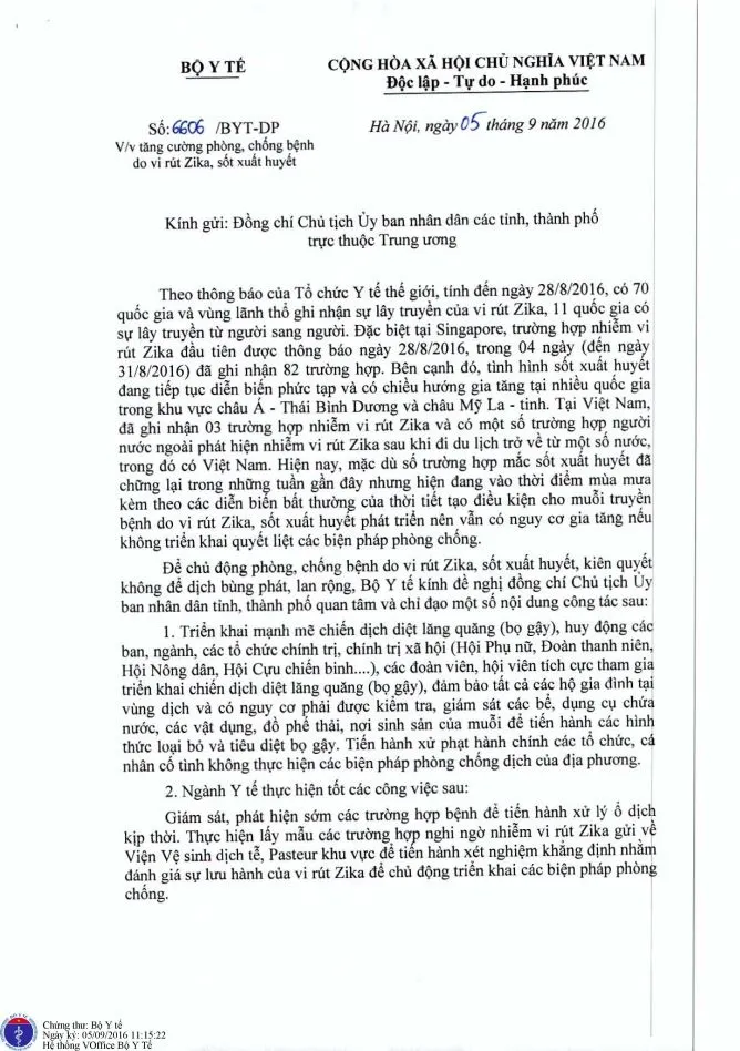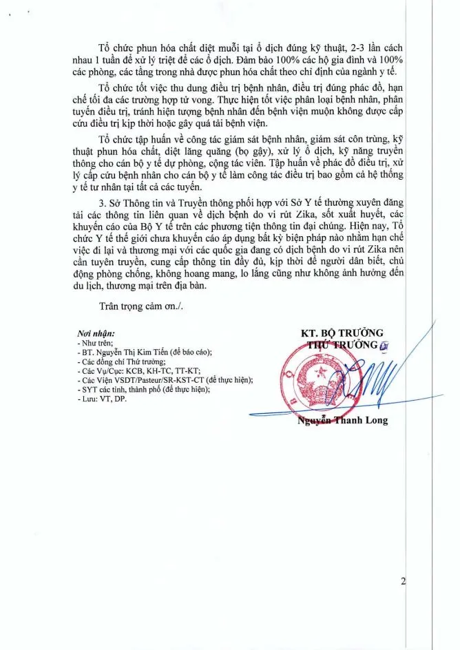 Bộ Y tế đề nghị Chủ tịch Ủy ban nhân dân tỉnh, thành phố quan tâm, chỉ đạo ngành y tế giám sát, phát hiện các trường hợp bệnh để tiến hành xử lý ổ dịch kịp thời. Thực hiện lấy mẫu các trường hợp nghi nhiễm vi rút zika gửi về Viện vệ sinh dịch tễ, pasteur khu vực để tiến hành xét nghiệm khẳng định nhằm đánh giá sự lưu hành của vi rút zika để chủ động triển khai các phương pháp phòng chống.