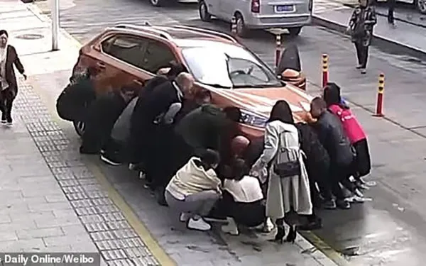 Ngay sau đó, những người đi đường (khoảng hơn 10 người) đã hô hoán lên và cùng nâng chiếc xe lên để giải cứu cô gái.