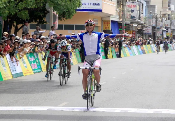 Tay đua Tăng Trí Hùng ăn mừng chiến thắng chặng 2 TP Vũng Tàu - TP Phan Thiết sau khi rút thắng các tay đua khác. Ảnh: K.H