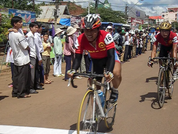 Các tay đua về đích chặng 3 (Đăk Lăk - Đắk Nông) Cuộc đua xe đạp NKKN lần thứ IX  - năm 2006 (ảnh: Minh Xuân).