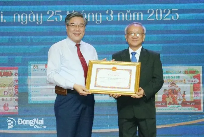 Phó chủ tịch UBND tỉnh Dương Minh Dũng tặng bằng khen cho Xổ số kiến thiết Đồng Nai có nhiều đóng góp trong hoạt động khuyến học, khuyến tài. Ảnh: xosodongnai.com.vn
