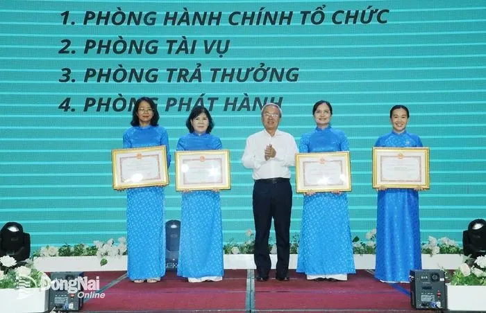 Chủ tịch Ủy ban MTTQ Việt Nam tỉnh Cao Văn Quang trao danh hiệu tập thể lao động xuất sắc cho các tập thể của công ty. Ảnh: xosodongnai.com.vn