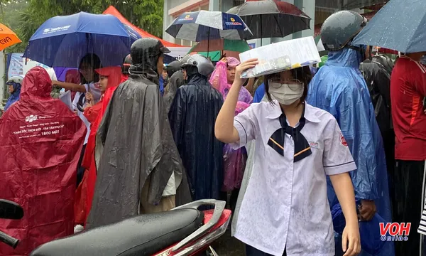 Tại điểm thi Trường THPT Trường Chinh (Quận 12), phụ huynh đội mưa chờ con trước điểm thi. Các đội hình tình nguyện Tiếp sức mùa thi tích cực che nón, dù hỗ trợ thí sinh ra xe.
