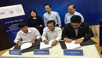 Đại diện 3 đơn vị ký biên bản ghi nhớ tài trợ thực hiện chương trình “Nước sạch học đường”.