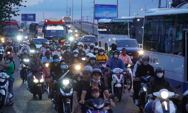 Hàng nghìn phương tiện, chủ yếu là xe máy chở theo đồ đạc lỉnh kỉnh, nối đuôi nhau di chuyển chậm, gây ùn ứ tại một số nút giao như Nguyễn Hữu Trí - Quốc lộ 1 hay khu vực gần cầu Bình Điền.