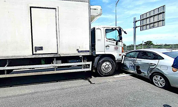 Chiếc xe tải mang biển số 86C1 - 163.61 xảy ra va chạm với xe ôtô 4 chỗ mang biển số 61A - 535.96. Tại hiện trường, xe ôtô 4 chỗ chắn ngang cao tốc bên phần đường hướng Ninh Thuận - Bình Thuận. Phần cửa bên ghế tài xế bị tông móp méo.