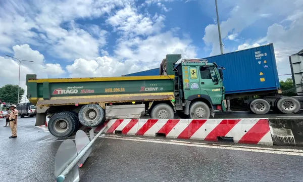Ngay sau đó, một xe ben mang biển số TPHCM di chuyển theo hướng ngược lại cũng xảy ra va chạm. Phương tiện này tông vào cột biển báo giao thông bên lề đường rồi tiếp tục leo lên dải phân cách, chắn ngang làn đường ngược chiều.
