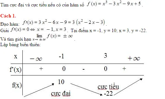 - Cách 1: Xét dấu f’(x) dựa vào định lí 2 để kết luận điểm cực đại, cực tiểu. Nếu f’(x) đổi dấu khi x quá xo thì hàm số có cực trị tại xo.