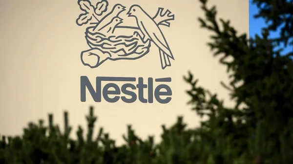 Logo của Tập đoàn Nestle tại Trung tâm nghiên cứu của tập đoàn ở Vers-chez-les-Blanc, Lausanne, Thụy Sĩ (Ảnh: AFP)