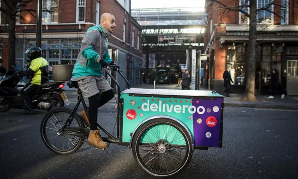 Một người giao đồ ăn lái chiếc xe đạp chở hàng của mình khi chuẩn bị nhận đơn hàng cho Deliveroo, tại London, Anh, vào ngày 22/12/2016 - Ảnh: Bloomberg