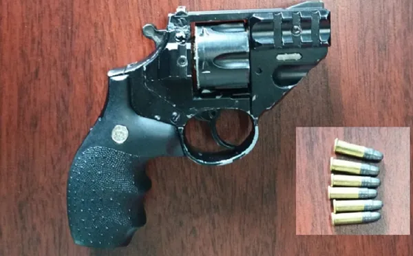 Qua đó, công an phát hiện 2 đối tượng đang vận chuyển 1 khẩu súng quân dụng Rulo, 6 viên đạn và 1 con dao tự chế.