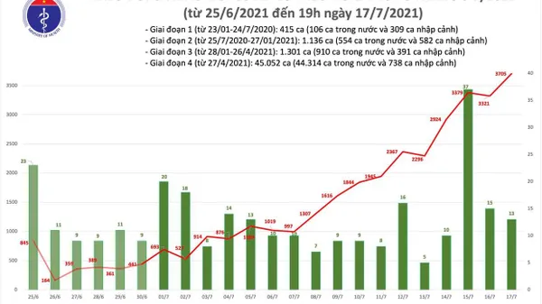 Tính đến 19 giờ ngày 17/7, Việt Nam có tổng cộng 45.884 ca ghi nhận trong nước và 2.020 ca nhập cảnh. Số lượng ca mắc mới ghi nhận trong nước tính từ ngày 27/4 đến nay là 44.314 ca, trong đó có 7.538 bệnh nhân đã được công bố khỏi bệnh.