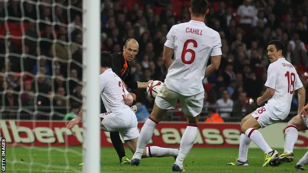Robben (đen) sút cầu môn trong trận giao hữu giữa Hà Lan và Anh.