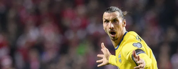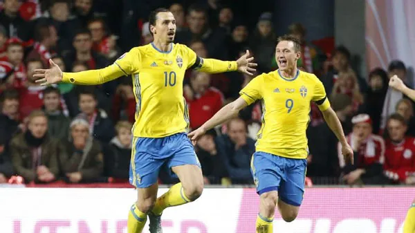 Tiền đạo Zlatan Ibrahimovic ăn mừng bàn thắng vào lưới Đan Mạch trong trận lượt về.