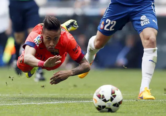Hậu vệ Espanyol phạm lỗi với Neymar. Ảnh: Reuters