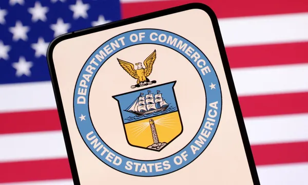 Logo Bộ Thương mại Mỹ và cờ Mỹ - Ảnh: Reuters
