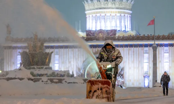 Một công nhân dọn tuyết tại Triển lãm Thành tựu Kinh tế Quốc dân (VDNH) trong trận tuyết rơi dày đặc ở Moscow, Nga ngày 3/12/2023 - Ảnh: Reuters