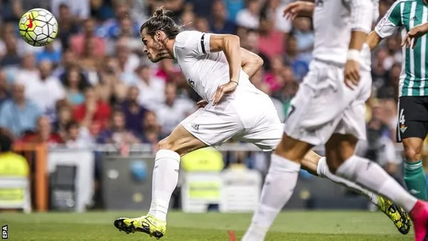 Tiền vệ Gareth Bale đánh đầu ghi bàn cho Real Madrid.