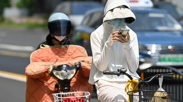 Một người phụ nữ mặc quần áo chống nắng đạp xe đi lại giữa thời tiết nắng nóng ở Thượng Hải vào ngày 29/5 - Ảnh: AFP