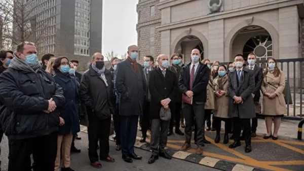 Các nhà ngoại giao phương Tây tụ tập bên ngoài tòa án ở Bắc Kinh nhằm phản đối việc Trung Quốc xét xử kín một cựu quan chức ngoại giao Canada vào ngày 22/3. (Ảnh: Getty Images)