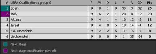 Với chiến thắng nhẹ nhàng 3-0 này, ĐT Tây Ban Nha cầm chắc vị trí dẫn đầu bảng G vòng loại khu vực châu Âu với 25 điểm (Italia bị Macedonia cầm chân 1-1 và phải thi đấu play-off).