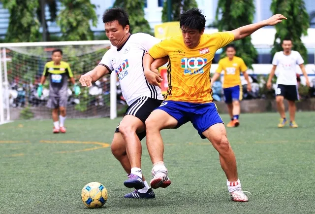 Một pha tranh chấp bóng khá quyết liệt giữa cầu thủ đội VOH (áo vàng) và CLB phóng viên thể thao 1