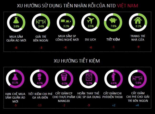 Khoảng 3 trên 5 người Việt đã giảm chi tiêu cho quần áo mới và cắt giảm chi phí giải trí bên ngoài so với cùng kỳ năm ngoái. Khoảng một nửa người tiêu dùng Việt đã cắt giảm chi phí ga, điện và chi phí điện thoại.
