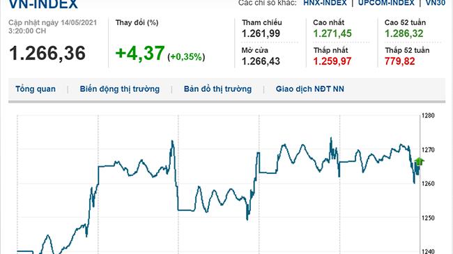 Đóng cửa phiên 14/5, VN-Index tăng 4,37 điểm (0,35%) lên 1.266,36 điểm, HNX-Index tăng 2,68% lên 294,72 điểm, UPCoM-Index giảm 0,21% xuống 81 điểm.