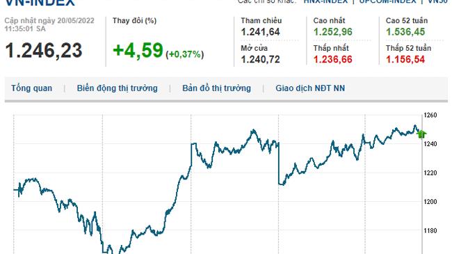 Dừng phiên sáng 20/5, VN-Index tăng 4,59 điểm (0,37%) lên 1.246,23 điểm, HNX-Index tăng 0,52 điểm ( 0,17%) đạt 308,54 điểm, UPCoM-Index giảm 0,21 điểm (0,22%) xuống 94,37 điểm.