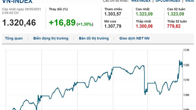 Đóng cửa phiên 28/5, VN-Index tăng 16,89 điểm (1,30%) lên 1.320,46 điểm, HNX-Index tăng 6,01 điểm (1,97%) lên 310,46 điểm, UPCoM-Index tăng 2,03 điểm (2,41%) đạt 86,11 điểm.