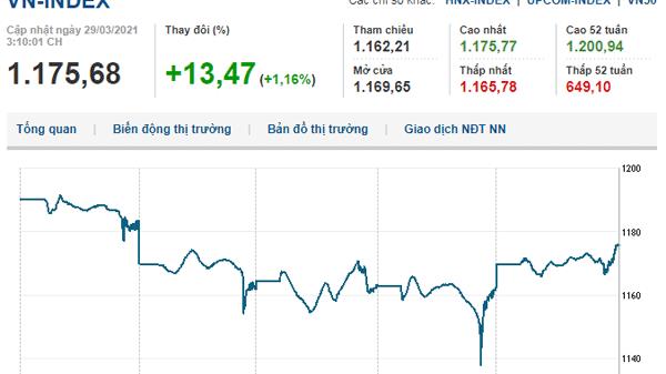 Kết phiên 29/3, VN-Index tăng 13,47 điểm (1,16%) lên 1.175,68 điểm, HNX-Index tăng 1,92% lên 276,16 điểm, UPCoM-Index tăng 0,84% lên 80,52 điểm.