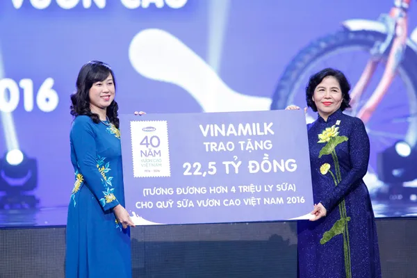 Bà Mai Kiều Liên – Tổng Giám Đốc Vinamilk trao bảng tượng trưng 22,5 tỷ đồng (tương đương khoảng 4 triệu ly sữa) cho Quỹ sữa Vươn cao Việt Nam năm 2016 cho trẻ em nghèo tại 40 tỉnh thành nhân kỷ niệm 40 năm thành lập công ty đến bà Đào Hồng Lan- Thứ Trưởng Bộ Lao động Thương binh và Xã hội.