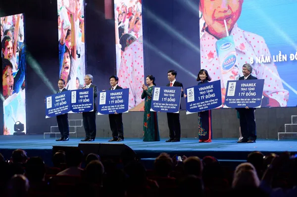 Tại Lễ kỷ niệm 40 năm, Vinamilk cũng đã dành tặng 6 tỷ đồng cho 6 tỉnh đang thực hiện chương trình Sữa học đường để động viên khích lệ những địa phương đang thực hiện tốt. Như vậy, tổng số tiền 20 tỷ đồng đồng Vinamilk đóng góp cho chương trình Sữa học đường tại 20 tỉnh trong năm 2016 sẽ tương đương với khoảng gần 4 triệu hộp sữa cho các em học sinh mầm non, tiểu học. Và nếu tính từ năm học 2009-2010, khi Vinamilk bắt đầu phối hợp cùng các tỉnh thực hiện chương trình thì tổng số lượng học sinh được thụ hưởng từ chương trình sẽ là 380 ngàn em học sinh và tổng ngân sách trợ giá từ Vinamilk là 92 tỷ đồng.