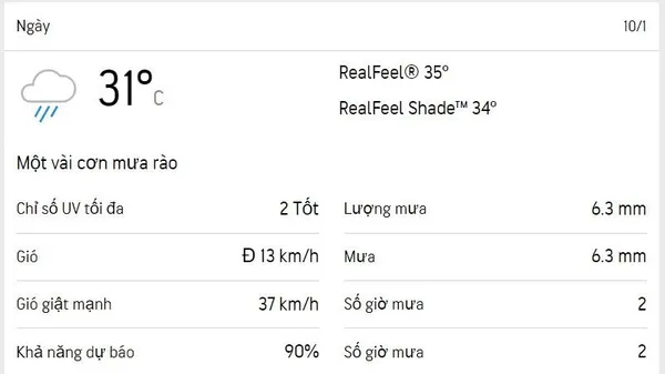 - Chiều 10/1 tiếp tục nhiều mây và ít nắng. Lúc 14-15 giờ, nhiều khu vực có mưa rào rải rác với tổng lượng mưa khoảng 6,3mm.