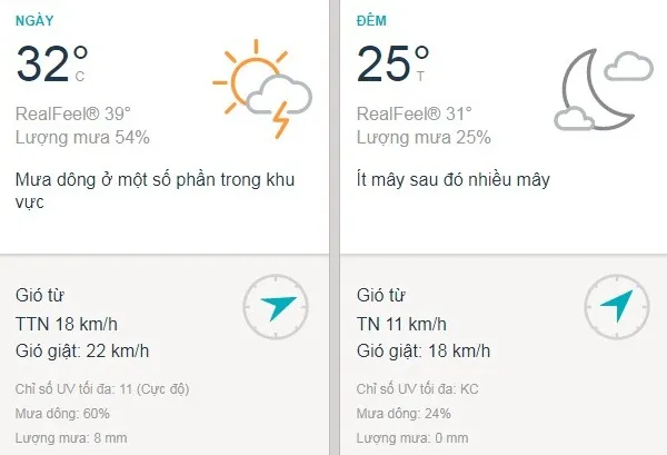 - Trời có thể có mưa dông rải rác vào thời điểm 13 giờ. Tổng lượng mưa khoảng 8 mm, thời gian mưa khoảng 2 giờ.