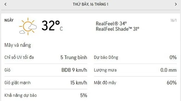 Chiều 16/1, nhiều mây; nhiệt độ tăng nhẹ so với sáng, trong khoảng 30-32 độ C.