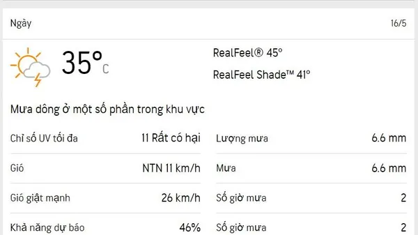 Sáng Thứ Ba 16/5, mật độ mây trung bình 45% nắng từng đợt, lượng UV cao nhất ở mức 11 - Nguồn: Accuweather